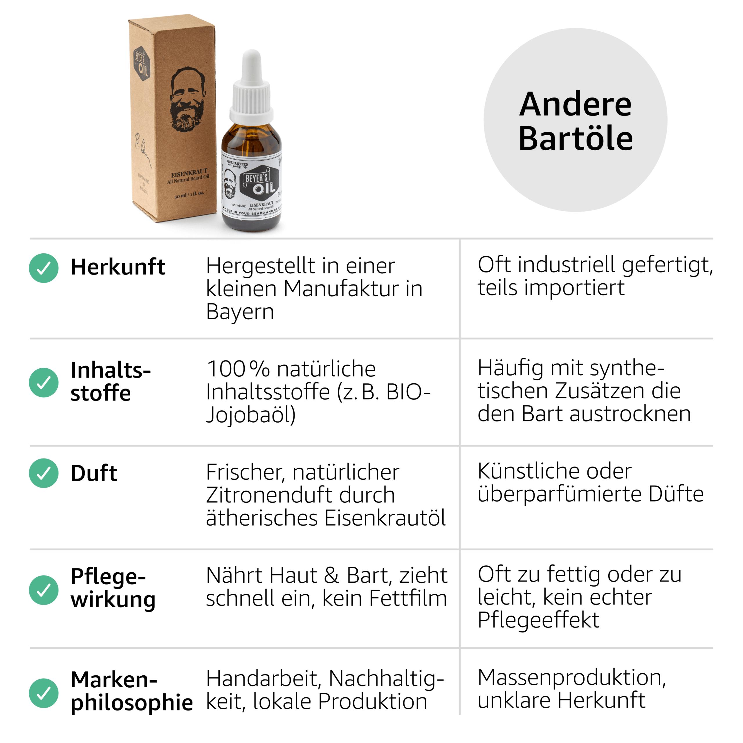 Das Beyer’s Oil Bartöl Eisenkraut sorgt für einen weichen, geschmeidigen und gepflegten Bart. Es wird in Bayern handgefertigt und besteht zu 100 % aus natürlichen Inhaltsstoffen – darunter Bio-Jojobaöl sowie ätherische Öle aus Zitronenverbene, Bergamotte und Lavendel.